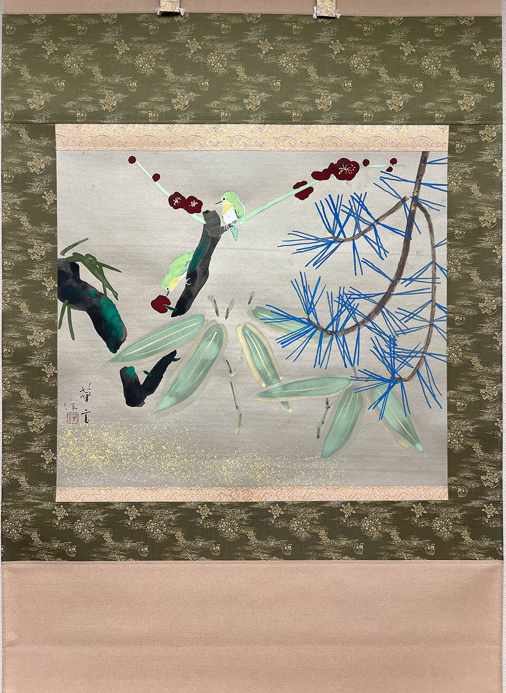 This hanging scroll is mounted using Kyō Hyōgu, a refined and traditional Kyoto mounting technique known for its exceptional quality.