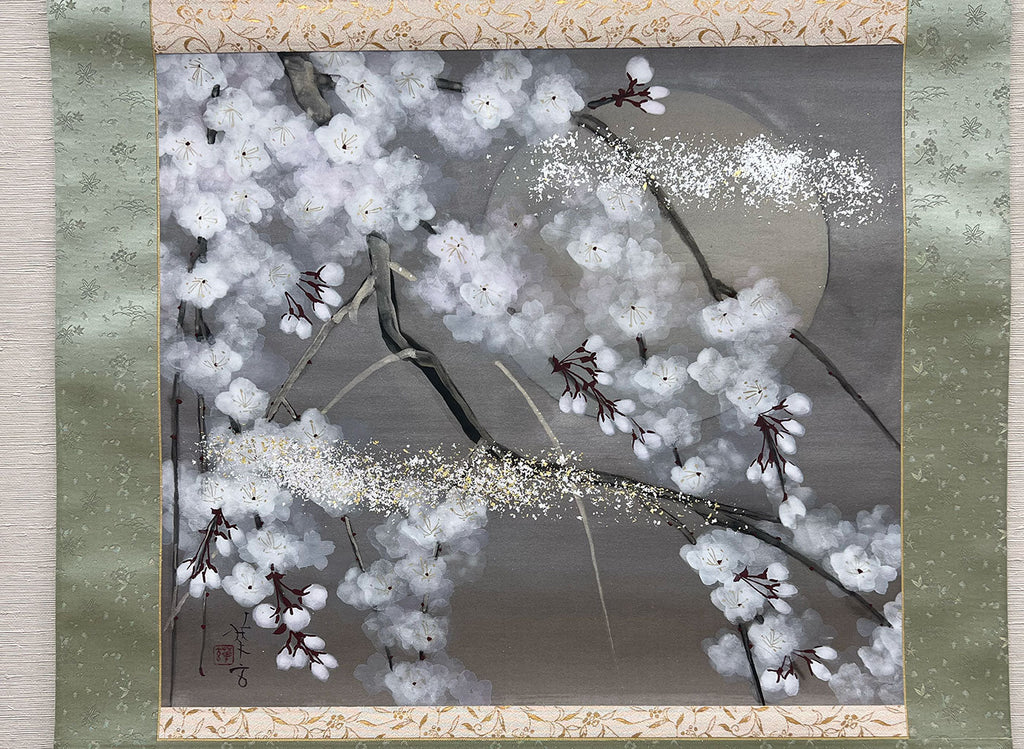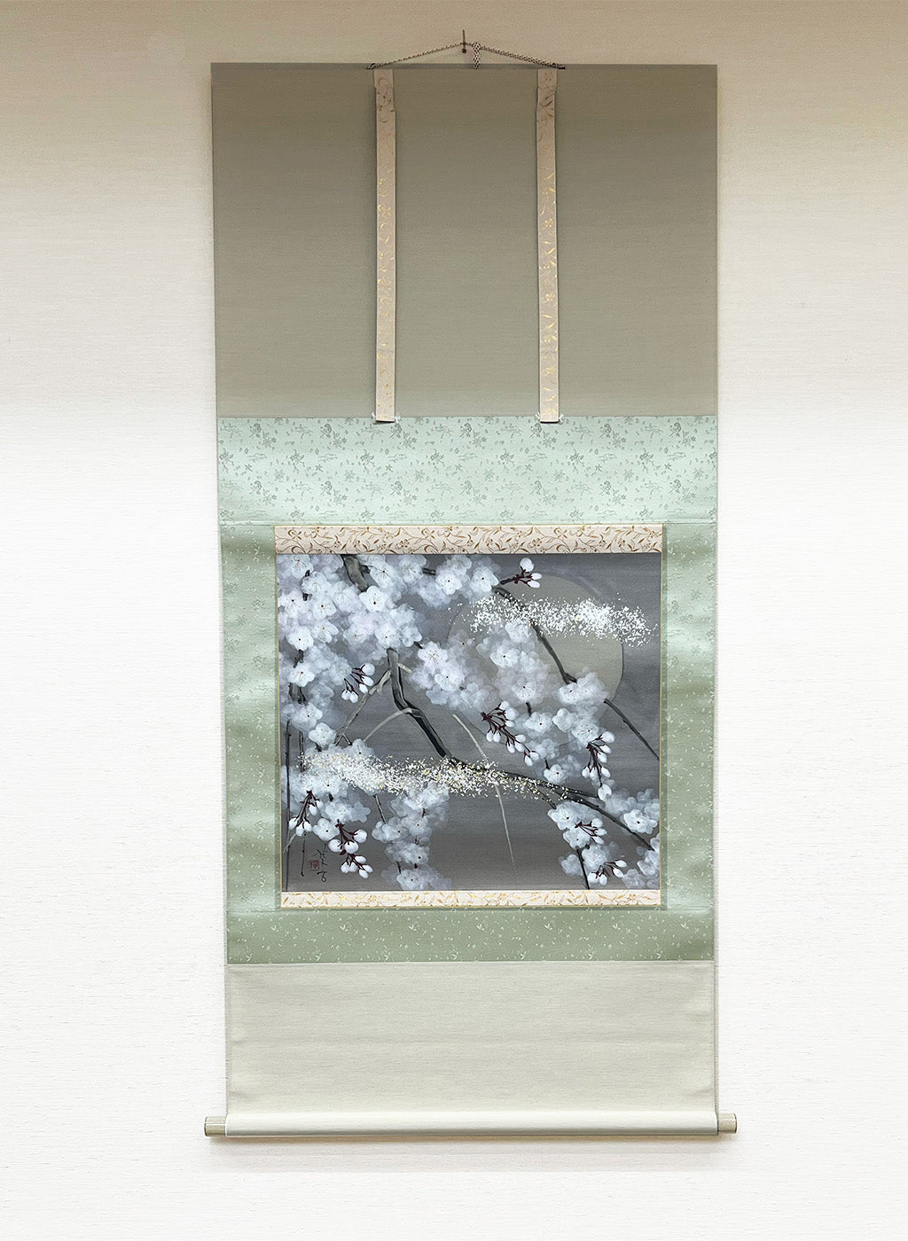 This hanging scroll is mounted using Kyō Hyōgu, a refined and traditional Kyoto mounting technique known for its exceptional quality.